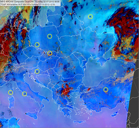 Figure 1: Avaliable radiosonde measurements at 12 UTC. Klick on the circles to see the radiosonde measurements.