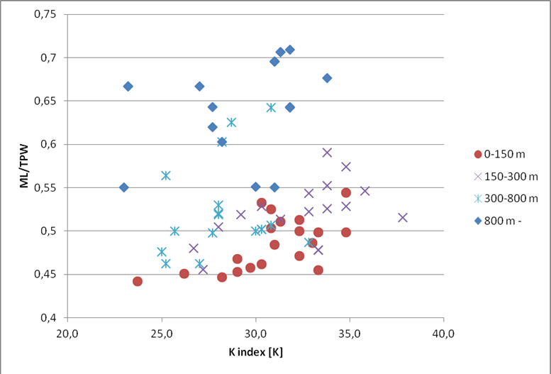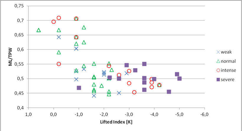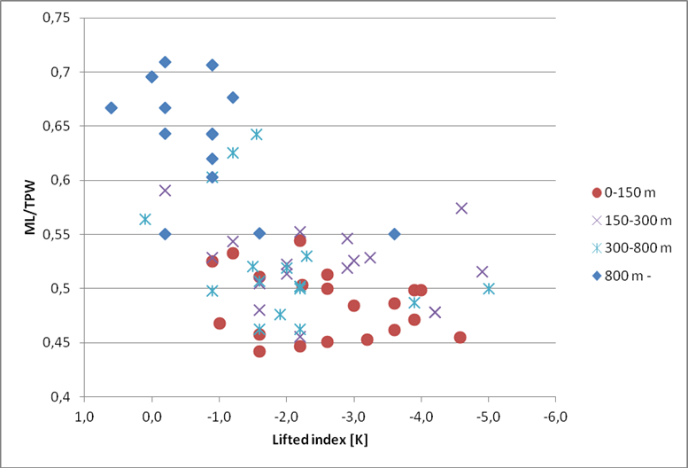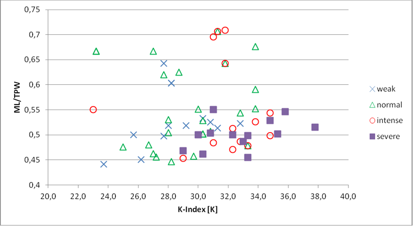 We calculated ML/TPW ratios, which are measure of the relative dryness of the mid-layer. Dry mid-layers can often cause strong downdrafts. Figs. 1, 2 and 3 show the relations between the ML/TPW ratio and different values of K-index, TPW and lifted index, respectively. The symbols indicate the intensity class of the convective events.