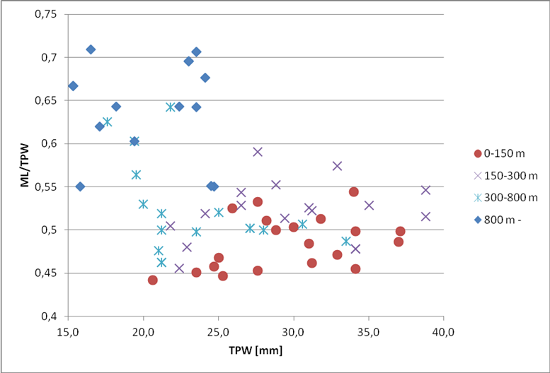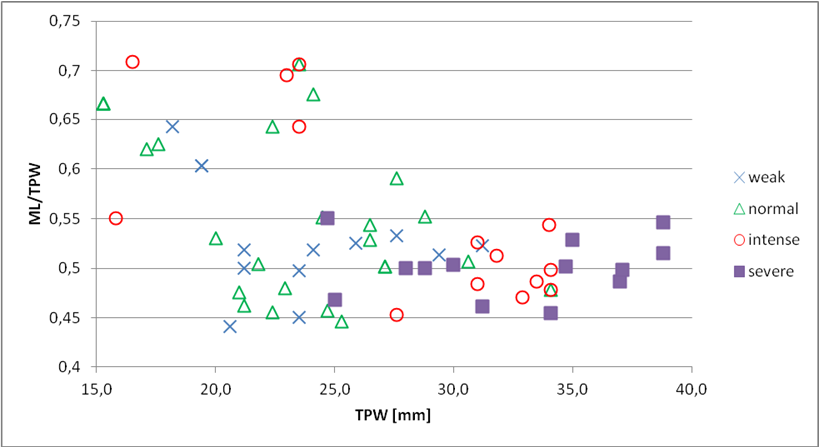 Figure 2: The relation between the ML/TPW and TPW for convective events of different intensity classes