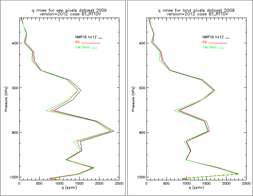 Figure 1: RMSE of the satellite-retrieved humidity volume mixing ratio profiles (q, ppmv) from January to December 2009 for sea pixels (left) and land pixels (right). The black, red and green curves correspond to the background NWP, first guess and first iteration retrieval, respectively.