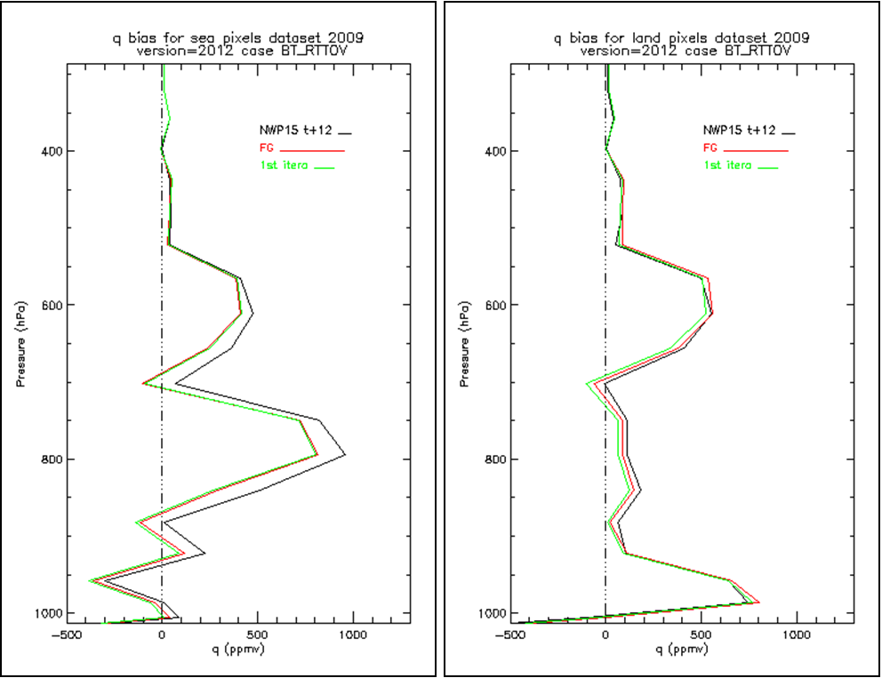 Figure 2: Bias of the satellite-retrieved humidity volume mixing ratio profiles (q, ppmv) from January to December 2009 for sea pixels (left) and land pixels (right). The black, red and green curves correspond to the background NWP, first guess and first iteration retrieval, respectively.