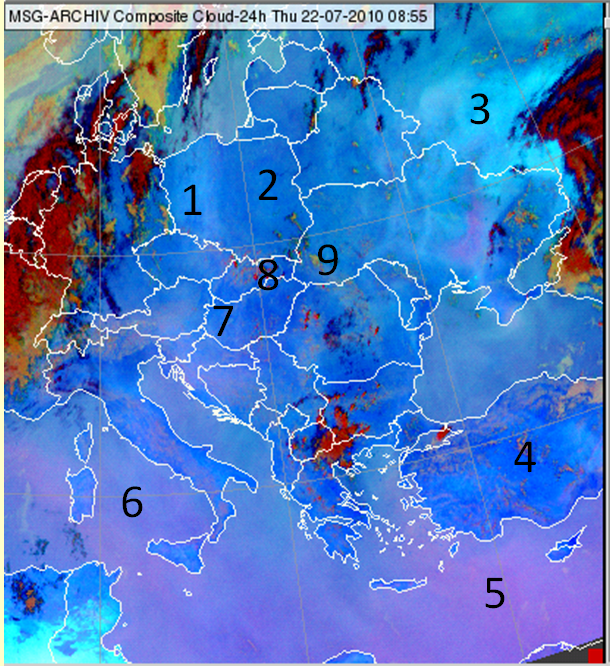 Figure 2: 24 hour Microphysics RGB data for 22 July 2010 08:55 UTC