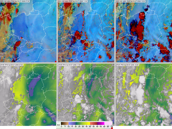 In the 24 hour Microphysics RGB (upper panels of Fig. 2), a north-south moisture boundary is seen over Poland, separating moist air in the west from dry air in the east. Thunderstorms developed during the day along this line. The moisture boundary is clearly visible in the SPhR TPW product (lower panels of Fig. 2).