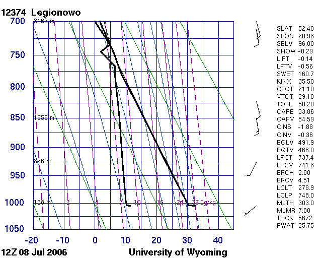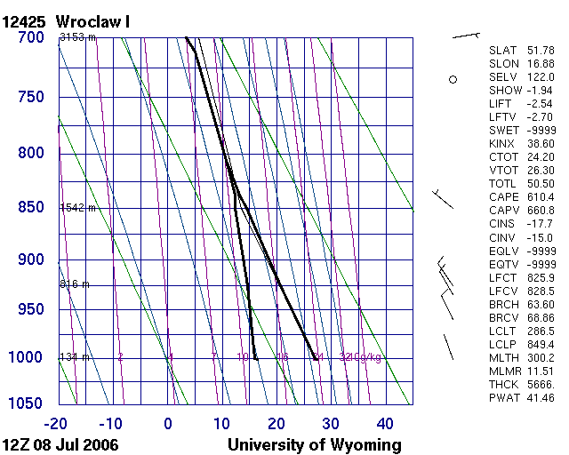 To explain this 'contradiction' we visualized the SPhR TPW, BL and ML (see the bottom rows of Figs. 16 and 17). The BL had moderate to high amounts of moisture, but the ML was very dry. K-index values were low because the 700 hPa dew point depression was high. (We also checked it in radiosonde sounding measurements: Fig. 18 shows sounding data at two Polish stations. Their locations are indicated in Fig. 16). However, the definition of the lifted index does not include any information from around 700 hPa, only the near-surface environment and around 500 hPa. The lifted index values seemed to have been unaffected by the very dry mid-layer. Lifted index calculations are based on the adiabatic lifting of a virtual air parcel up to 500 hPa. However, in reality the lifting is not adiabatic in such a dry environment, and some mixing with the environment is inevitable.