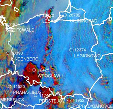 To check the satellite TPW retrieval and the interpretation of the RGB colors (dark blue as more moist, light blue as less moist at low levels) radiosonde data were studied. Fig. 3 shows soundings measured in Legionowo (east of the moisture boundary) and Wroclaw (west of it). In Legionowo the dew point depression was almost twice as high as in Wroclaw. The radiosonde-derived TPW values were 25.75 mm in Legionowo and 41.46 mm in Wroclaw, confirming that the moisture content was much higher in western than eastern Poland.