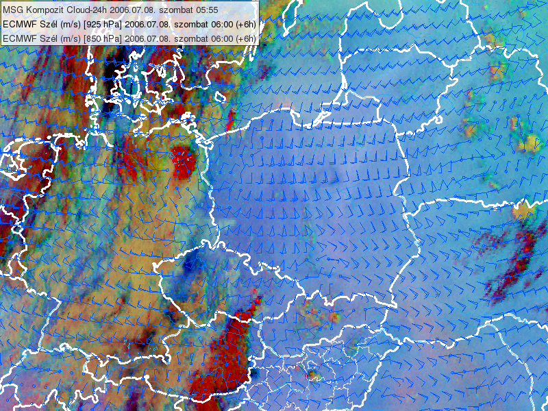 Figure 4: 24 hour Microphysics RGB from 8 July 2006, 05:55 UTC overlaid with ECMWF 850 and 925 hPa wind fields (00+06 UTC) (left) and 24 hour Microphysics RGB from 8 July 2006 at 08:55 UTC overlaid with the average of the 1000, 925, 850 and 700 hPa ECMWF Relative Humidity (00+09 UTC), 8 July 2006, 09 UTC (right). (Courtesy of Kovács Adrián, ELTE University)