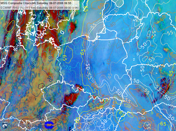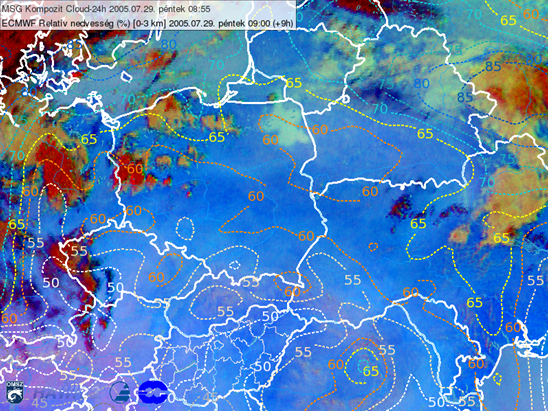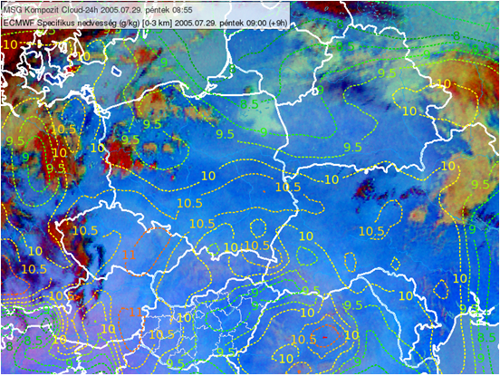 Figure 7: 24 hour Microphysics RGB from 29 July 2005 at 08:55 UTC overlaid with a ECMWF specific humidity forecast (left) and relative humidity forecast (right), 29 July 2005 at 09 UTC. The average of the humidity fields at 1000, 925, 850 and 700 hPa levels are shown as dashed isolines. (Courtesy of Kovács Adrián, ELTE University)