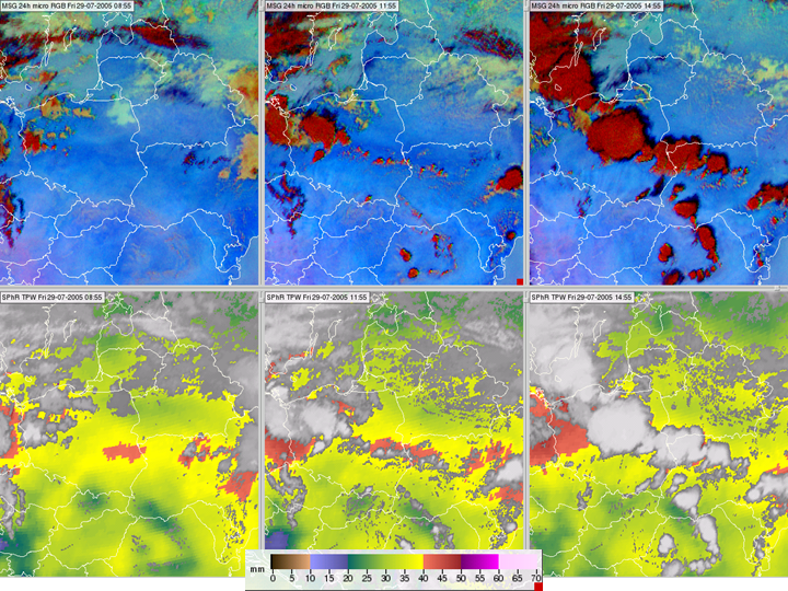 Figure 6: 24 hour Microphysics RGB images (upper row) and SPhR TPW products (bottom row) for 29 July 2005, 08:55, 11:55 and 14:55 UTC in the left, middle and right panels, respectively