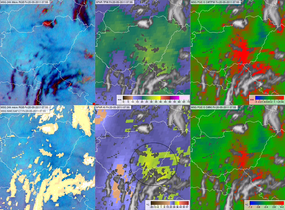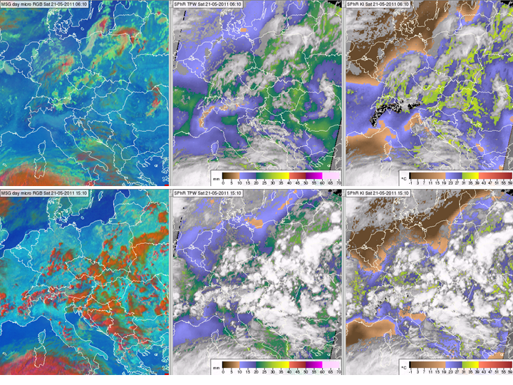 Figure 9: Meteosat SEVIRI images and products from 21 May 2011 at 06:10 (top row) and 15:10 UTC (bottom row): Day Microphysics RGB image (left column), SPhR TPW (middle column), SPhR K-Index (right column).