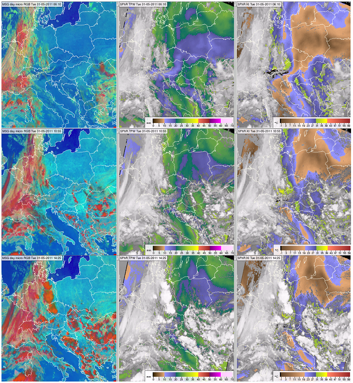 Figure 10: Meteosat SEVIRI images and products from 31 May 2011, 06:10 (top row), 10:55 (middle row) and 14:25 UTC (bottom row): Day Microphysics RGB image (left column), SPhR TPW (middle column) and SPhR K-Index (right column).