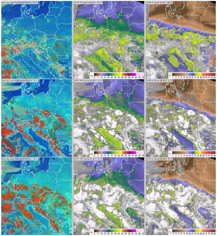 Figure 11: Meteosat SEVIRI images and products from 4 June 2011, 06:10 (top row), 13:10 (middle row) and 16:10 UTC (bottom row): Day Microphysics RGB image (left column), SPhR TPW (middle column) and SPhR K-Index (right column). Press the orange play button to see the animation.