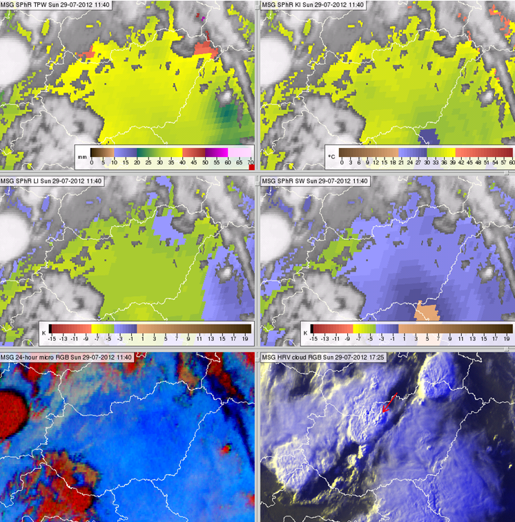 Figure 13 Meteosat SEVIRI images and products from 29 July 2012, 11:40 UTC, except the lower right panel, which is from 17:25 UTC: satellite-retrieved TPW (top left), K-Index (top right), Lifted Index (middle left), Showalter Index (middle right), 24 hour Microphysics RGB image (bottom left) and HRV cloud RGB image (bottom right).
