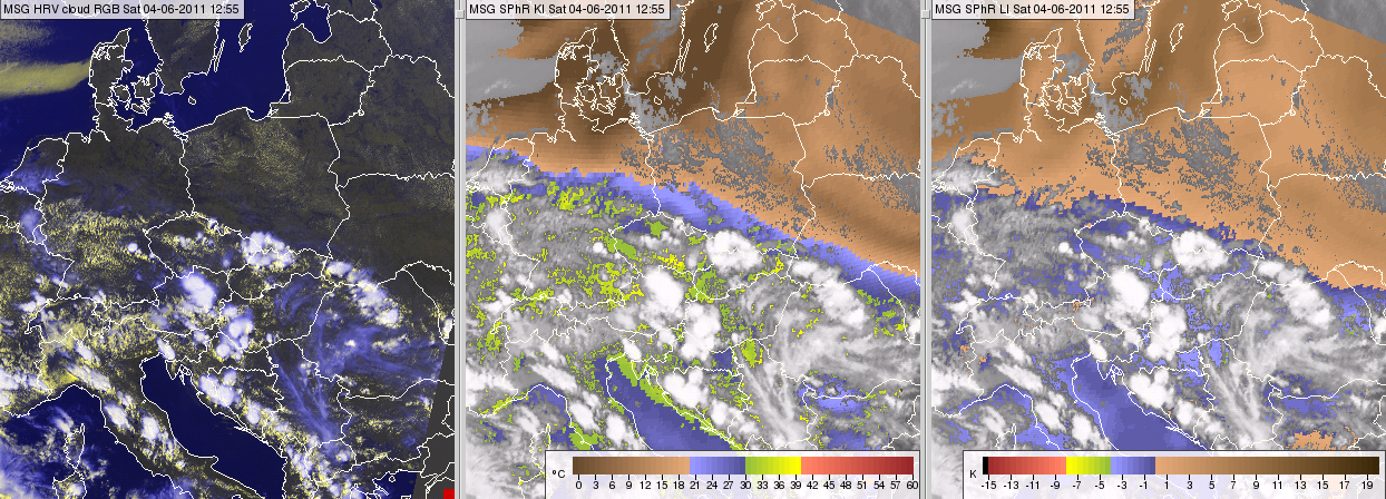 Figure 14 Meteosat SEVIRI image and products from 4 June 2011, 12:55 UTC: HRV cloud RGB image (left), satellite-retrieved SPhR K-Index (middle) and Lifted Index (right).