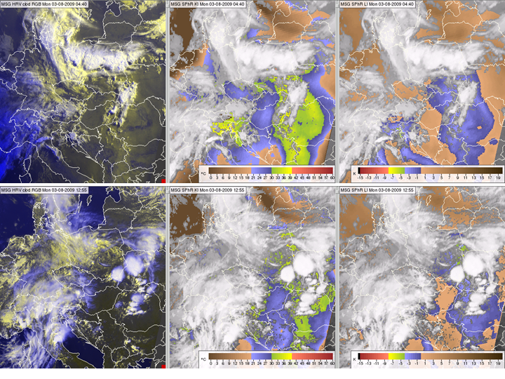 Figure 15: Meteosat SEVIRI images and products from 3 August 2013, 04:40 (top) and 12:55 UTC (bottom): HRV cloud RGB images (left), satellite-retrieved SPhR K-Index (middle) and Lifted Index (right).