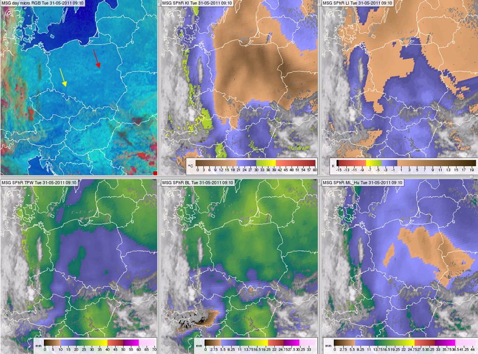 Figure 16 Meteosat SEVIRI image and products from 31 May 2011, 09:10 UTC: Day Microphysics RGB (top left), satellite-retrieved K-Index (top middle), Lifted Index (top right), TPW (bottom left), BL (bottom middle) and ML (bottom right). The yellow and red arrows indicate the locations of Wraclaw and Legionowo radiosonde stations, respectively. The corresponding soundings are presented in Fig. 18.