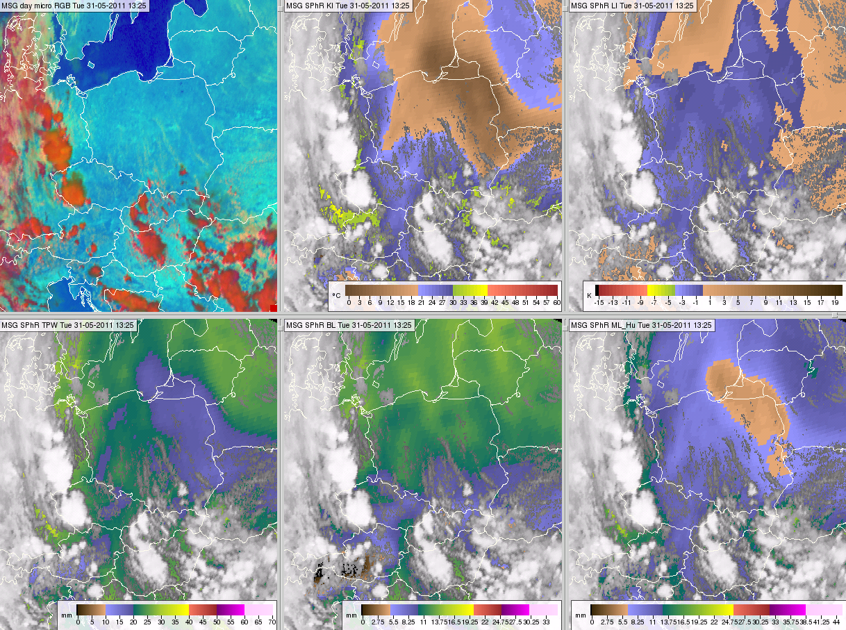 Figure 17 Meteosat SEVIRI image and products from 31 May 2011, 13:25 UTC: Day Microphysics RGB (top left), satellite-retrieved K-Index (top middle), Lifted Index (top right), TPW (bottom left), BL (bottom middle) and ML (bottom right)
