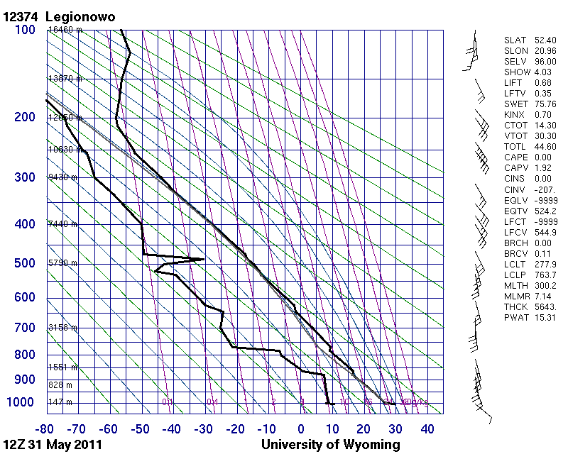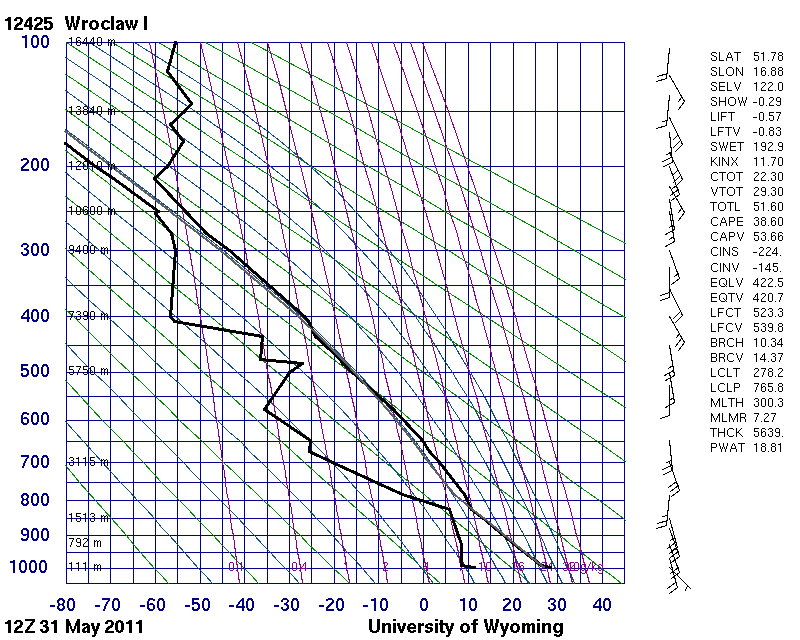 Figure 18: Radiosonde data measured at 31 May 2011, 12 UTC in Legionowo and Wroclaw, Poland. The locations of the stations are indicated in Fig. 16.