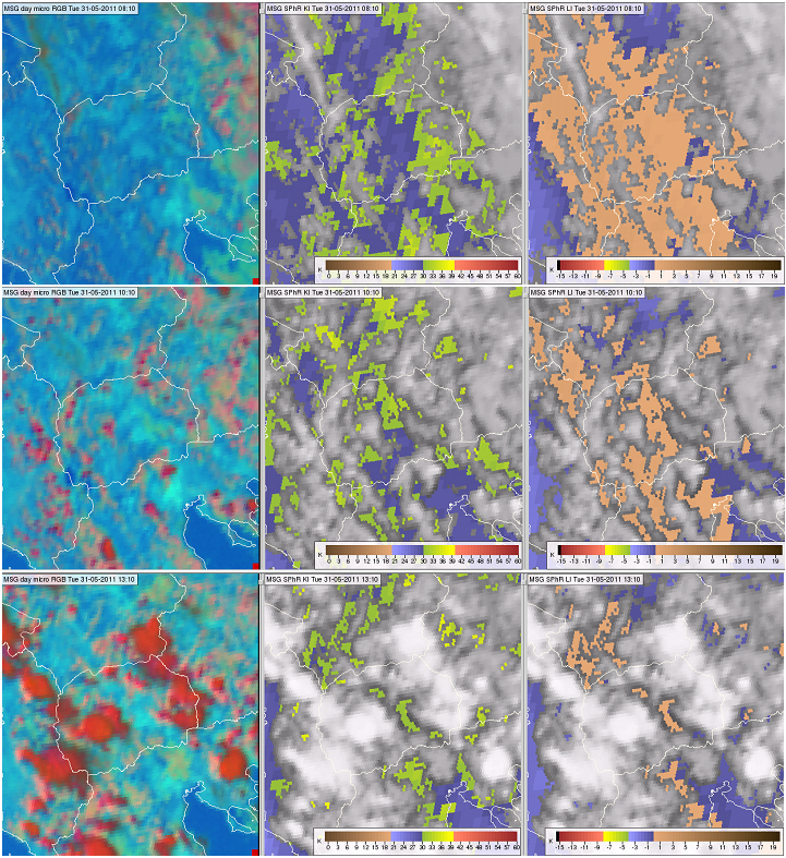 Figure 19: Meteosat SEVIRI images and products from 31 May 2011 at 08:10 (top row), 10:10 (middle row) and 13:10 UTC (bottom row): Day Microphysics RGB (left panels), satellite-retrieved K-Index (middle panels) and Lifted Index (right panels).