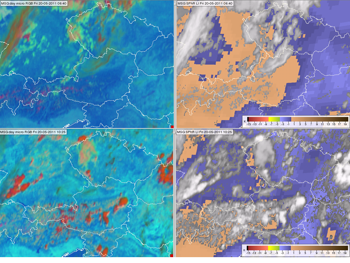 Figure 20 Meteosat SEVIRI images and products from 20 May 2011 at 06:40 (top row) and 10:25 UTC (bottom row): Day Microphysics RGB (left panels), satellite-retrieved Lifted Index (right panels).