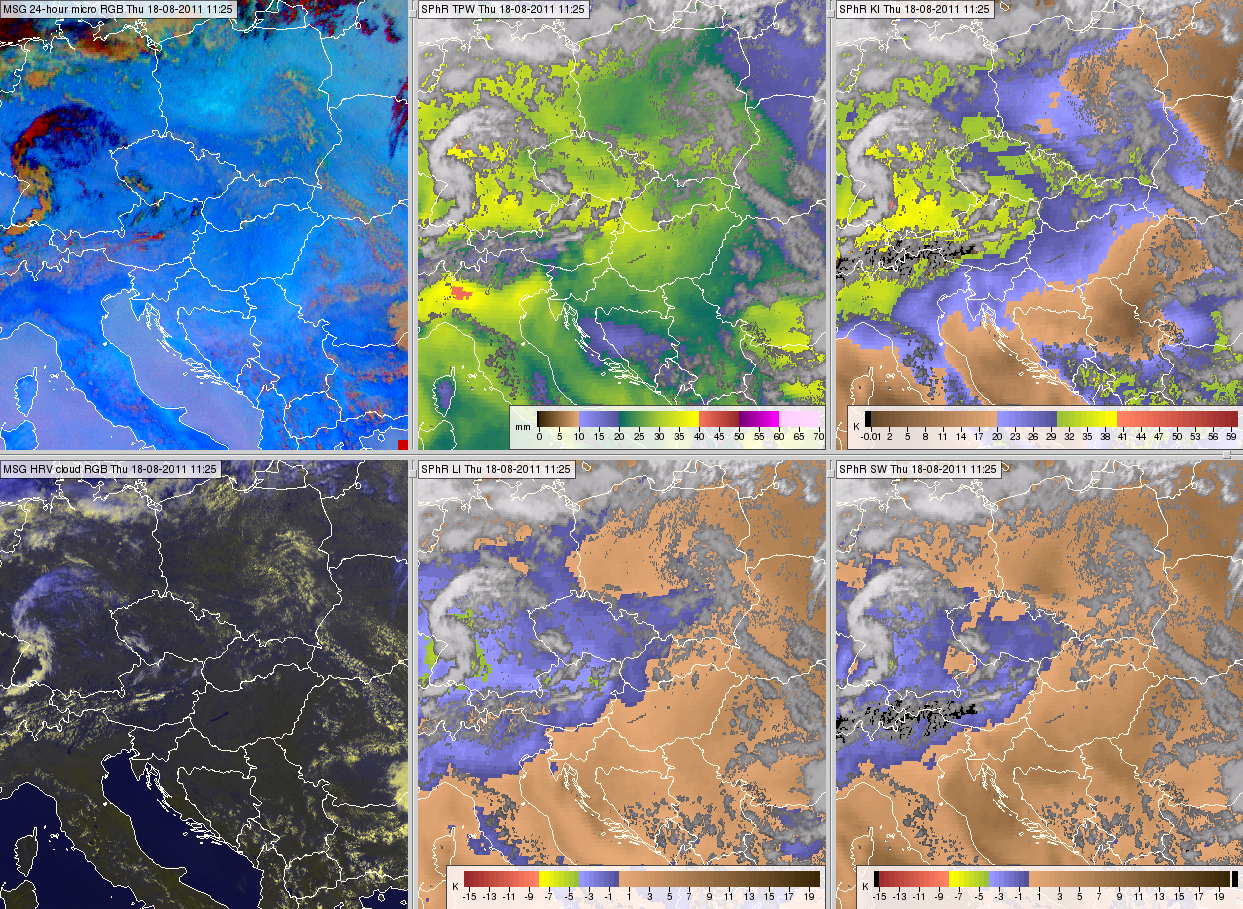 Figure 21: Meteosat SEVIRI images from 18 August 2011, 11:40 UTC: 24 hour Microphysics RGB (top left), SPhR TPW (top middle), SPhR K-Index (top right), HRV cloud RGB image (bottom left), SPhR Lifted Index (bottom middle) and SPhR Showalter Index (bottom right). Black color stands for no data.