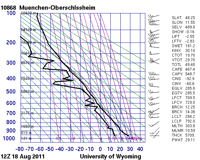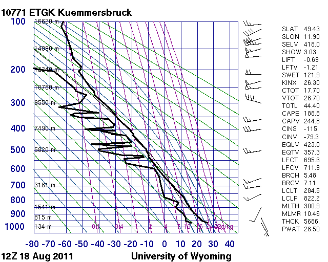 Figure 22: Radiosonde data measured on 18 August 2011, 12 UTC in Kümmersbruck and in München-Oberschleissheim in southern Germany