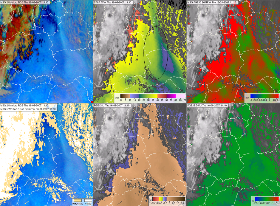Figure 24: Satellite images and SPhR products for 16 August 2007, 11:10 UTC. 24 hour Microphysics RGB (top left), satellite-retrieved TPW (top middle), difference between the satellite-retrieved and ECMWF forecasted TPW (top right), 24 hour Microphysics RGB overlaid with the cloud mask (bottom left), satellite-retrieved Lifted Index (bottom middle), difference between the satellite-retrieved and the ECMWF forecasted Lifted Indices (bottom right)..