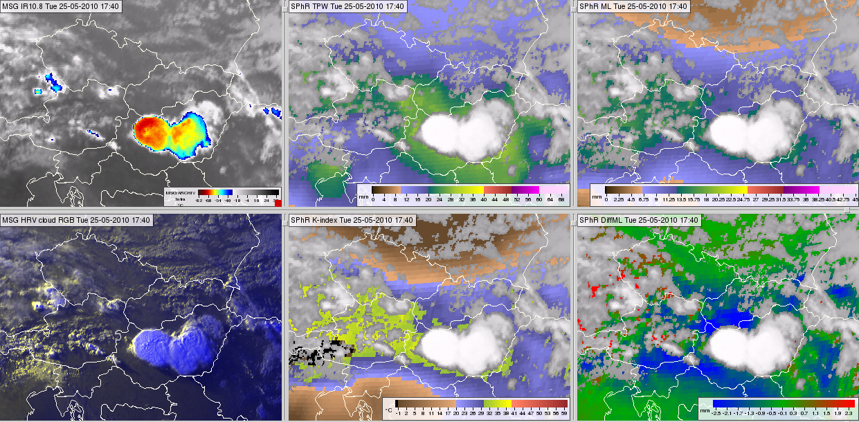 Figure 14: Meteosat-9 images and SPhR products from 25 May 2010, 17:40 UTC: IR10.8 image (upper left), TPW (upper middle), ML (upper right), HRV cloud RGB (bottom left), K-Index (bottom middle) and DiffML (bottom right)