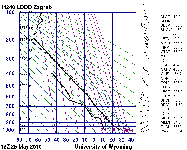 Table 1: TPW and K-index values derived from the Zagreb radiosonde measurement, retrieved from satellite data and forecasted by ECMWF model for 25 May 2010, 12 UTC.