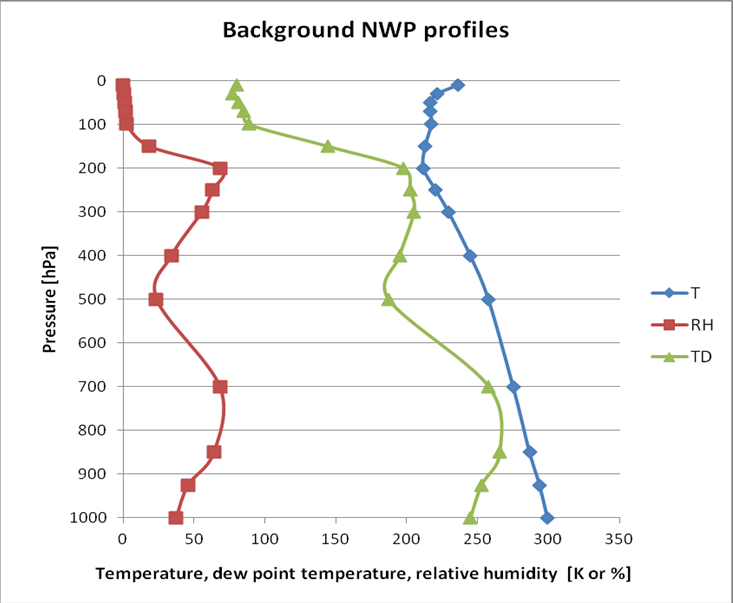 We looked at one cloud-free pixel to see the difference between NWP forecasted and satellite-retrieved temperatures and moisture profiles (optional output). The right panel of Fig. 16 shows the ECMWF forecasted profiles (based on the 00 UTC run, valid for 12 UTC) for the location indicated by the yellow arrow in the left panel. These ECMWF forecasted profiles are interpolated spatially and temporally to the satellite pixel and slot time. Air temperature, relative humidity and dew point temperature values are presented. The background profile shows a dry mid-layer.