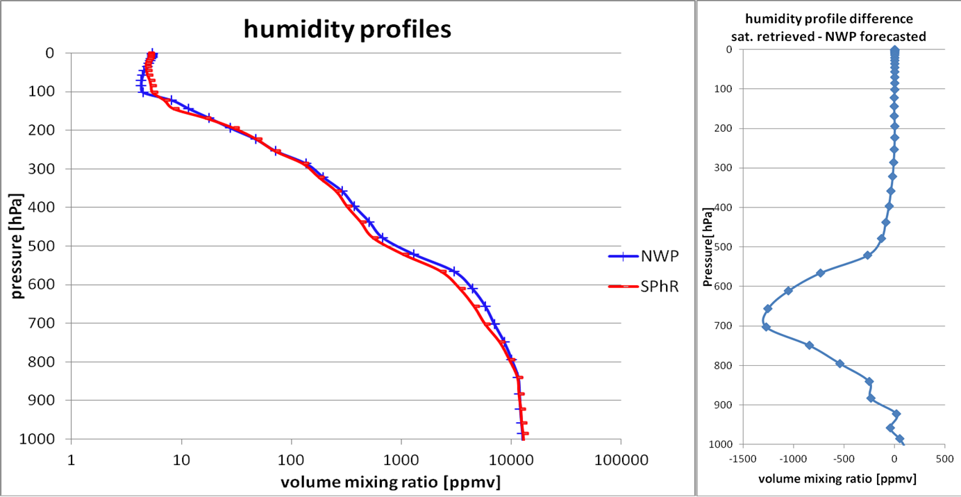Figure 17: Satellite-retrieved (red curve) and ECMWF forecasted (blue curve) humidity profiles (left) and their difference (right). The profiles correspond to the pixel indicated in Fig. 16. The ECMWF forecast is based on the 00 UTC run and valid for 12 UTC.