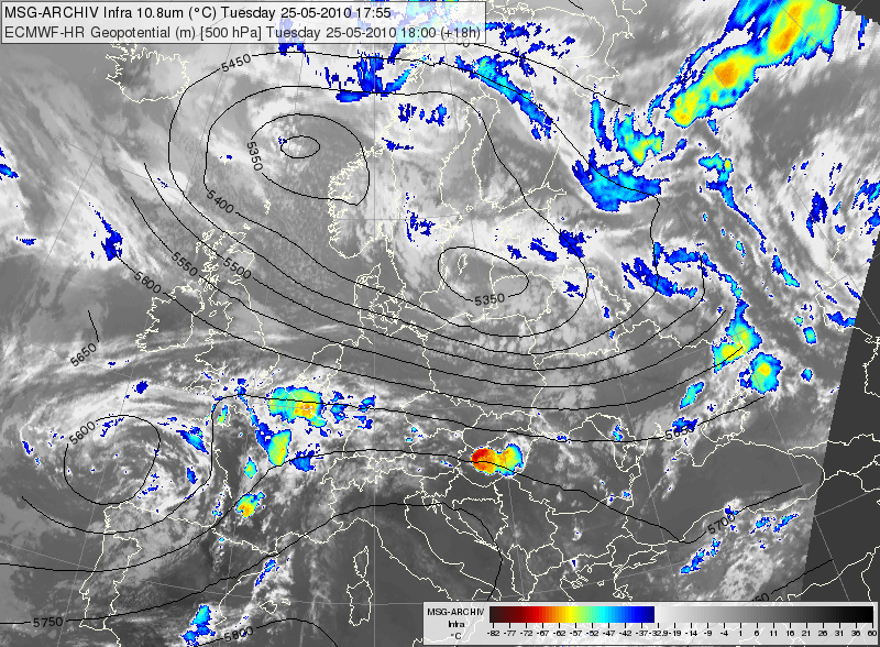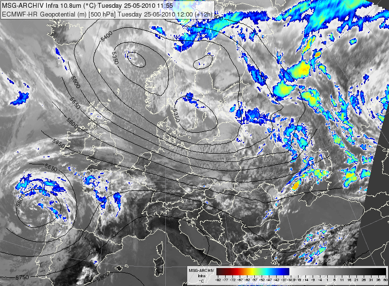 Figure 7: Meteosat SEVIRI IR10.8 image overlaid with forecasted 500 hPa geopotential, 25 May 2011, 12 (left) and 18 (right) UTC