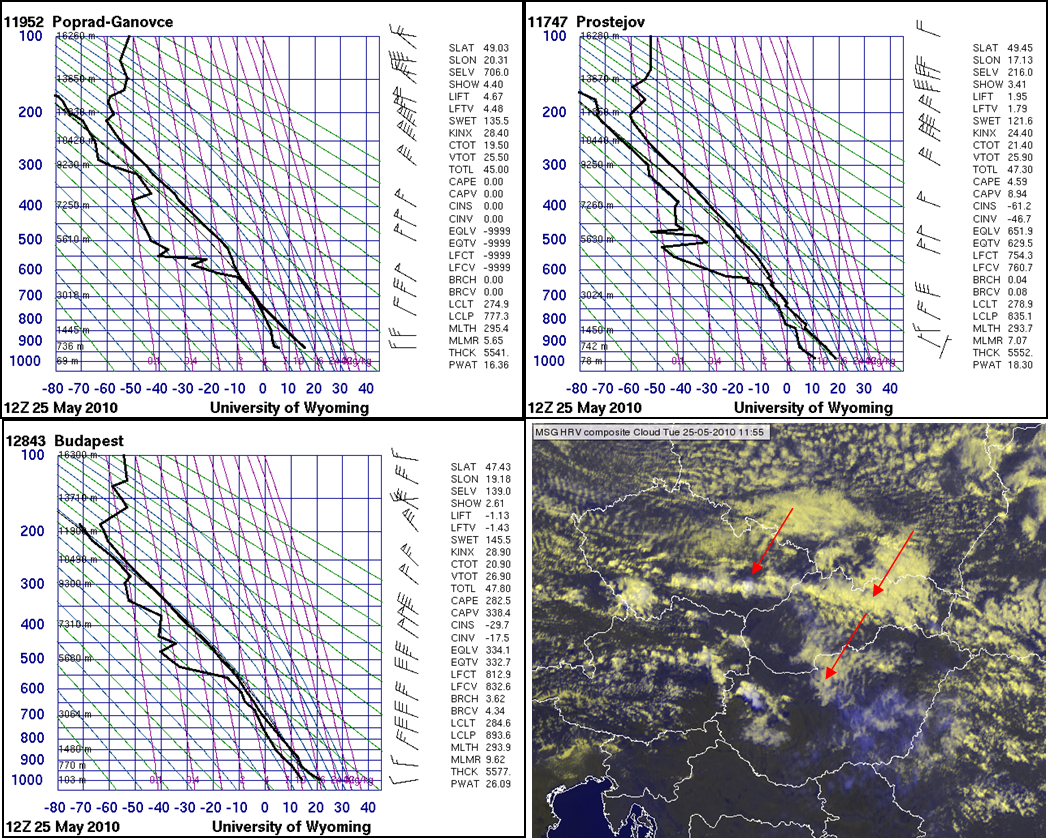 Figure 8: Radiosonde data from 25 May 2010, 12 UTC measured at Poprad-Ganovce, Slovakia (upper left), Prostejov, Czech Republic (upper right) and Budapest, Hungary (bottom left). The red arrows indicate the locations of the three radiosonde stations in the 11:55 UTC satellite image (bottom right).