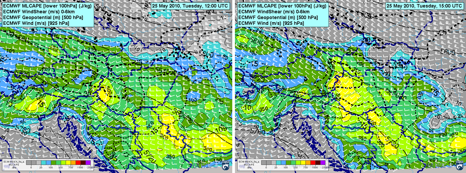 Figure 9: ECMWF forecasted geopotential height at 500 hPa (solid black lines), wind at 925 hPa, wind shear of the 0-6 km layer (broken lines), MLCAPE (mixed layer CAPE, colors) for 25 May 2011 at 12 (left) and 15 UTC (right).