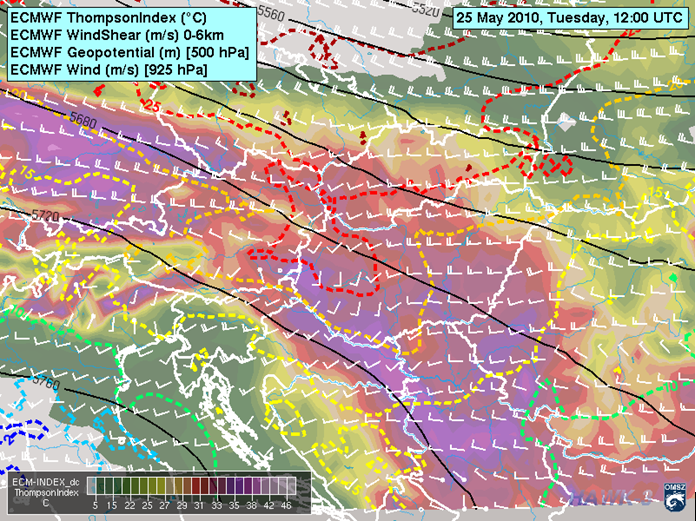 Figure 10: ECMWF forecasted geopotential height at 500 hPa (solid black lines), wind at 925 hPa, wind shear of the 0-6 km layer (broken lines) and Thomson index (colors) for 25 May 2011, 12 UTC