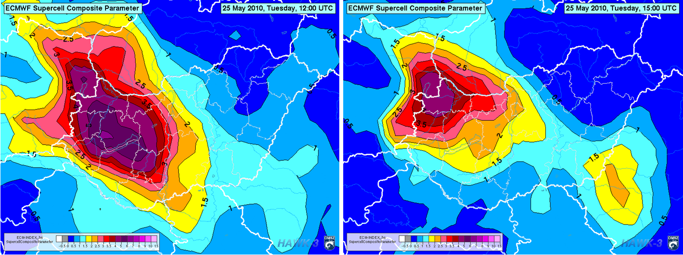 Figure 11: ECMWF derived Supercell Composite Parameter (colors and lines) for 25 May 2010 at 12 (left) and 15 (right) UTC