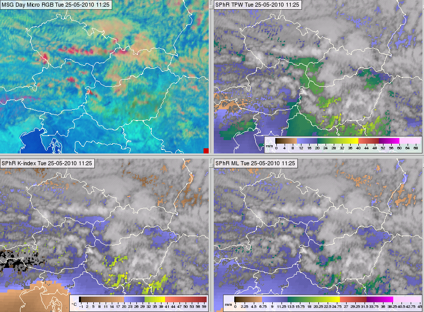 Figure 12: Meteosat-9 image and SPhR products from 25 May 2010, 11:25 UTC: Day Microphysics RGB image (upper left), TPW (upper right), K-Index (bottom left) and ML (bottom right).