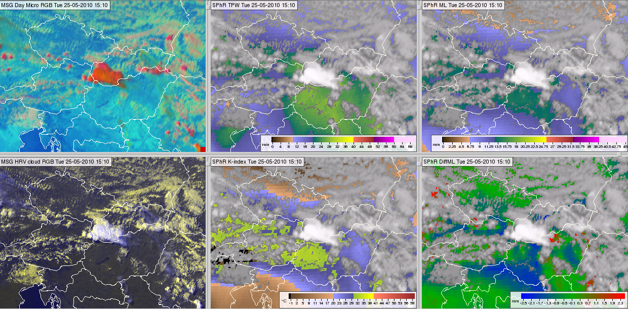 Figure 13: Meteosat-9 images and SPhR products from 25 May 2010, 15:10 UTC: Day Microphysics RGB (upper left), TPW (upper middle), ML (upper right), HRV cloud RGB (bottom left), K-Index (bottom middle) and DiffML (bottom right).