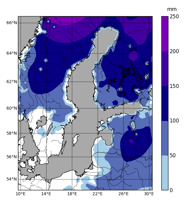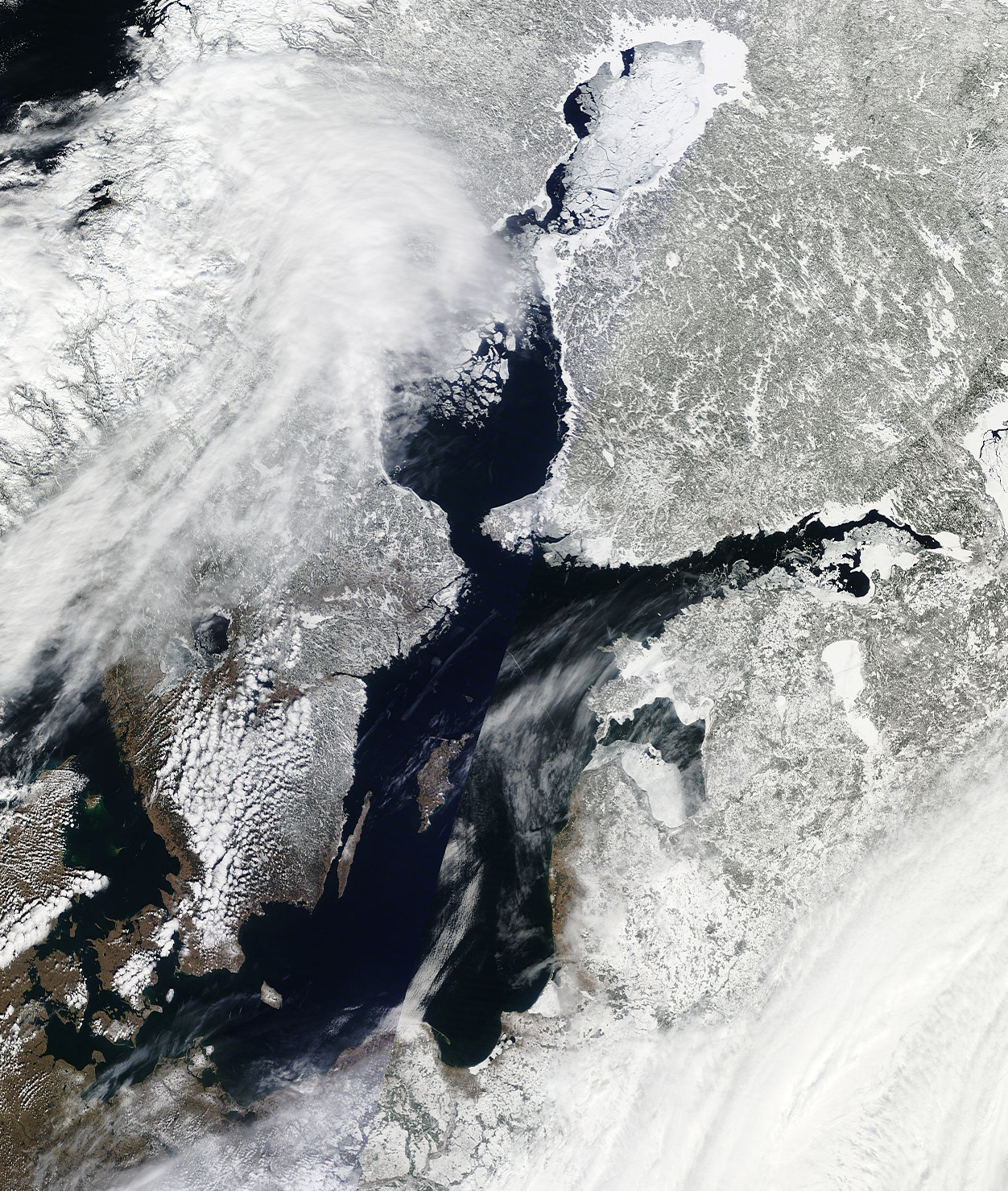 Figure 1: Snow cover in the Baltic Sea region on 6 April 2013. On the left - an image in MODIS-Terra visible spectrum; on the right - a picture of snow water equivalent from GlobSnow-2 data set.