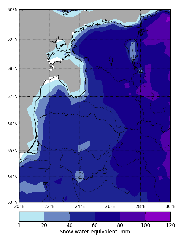 SWE can vary greatly between subsequent days due to temperature fluctuations or an influx of freshly fallen snow, so it is not possible to fill SWE data gaps using temporal filtering. Average maximum SWE in the Baltic States varies from 20 mm in the western coastal areas to 120 mm in the continental parts to the east (Fig. 1).