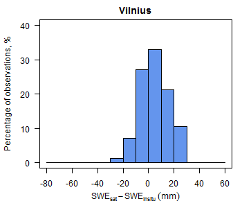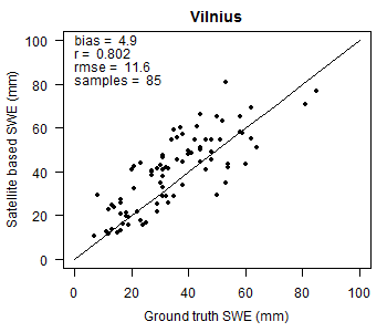Satellite-based SWE validation with ground data was performed at three meteorological stations in the Baltic States: Kuusiku (Estonia), Dobele (Latvia) and Vilnius (Lithuania) (Fig. 2). Statistical evaluation of the satellite data's accuracy varied between the regions and stations (Table 1). The largest bias (-4.1 mm) and RMSE (28.0 mm) were determined at Dobele. However, the sample size at this location was very small due to the gaps in ground measurements and satellite observations. Correlation coefficient between satellite-based SWE and in-situ measurements was 0.64 for Dobele, 0.80 for Vilnius, and 0.91 for Kuusiku.