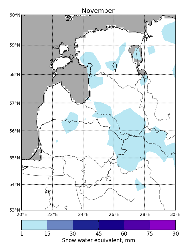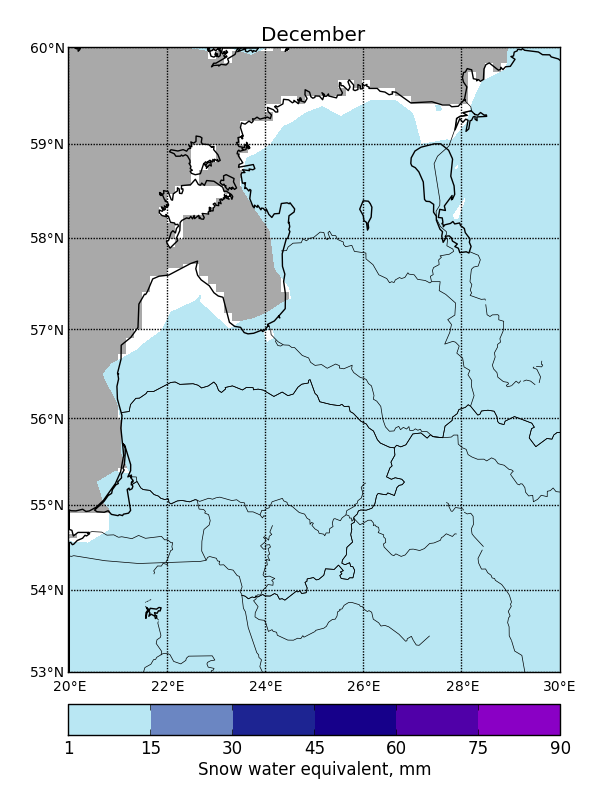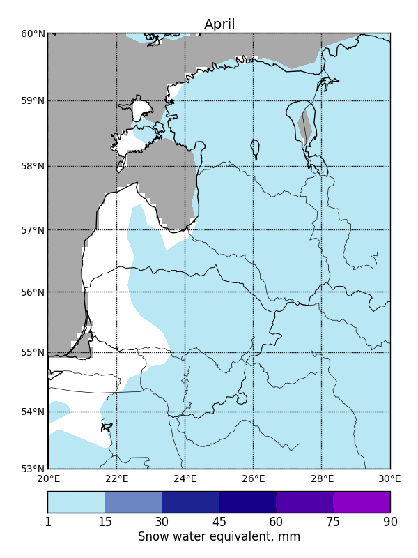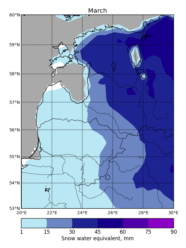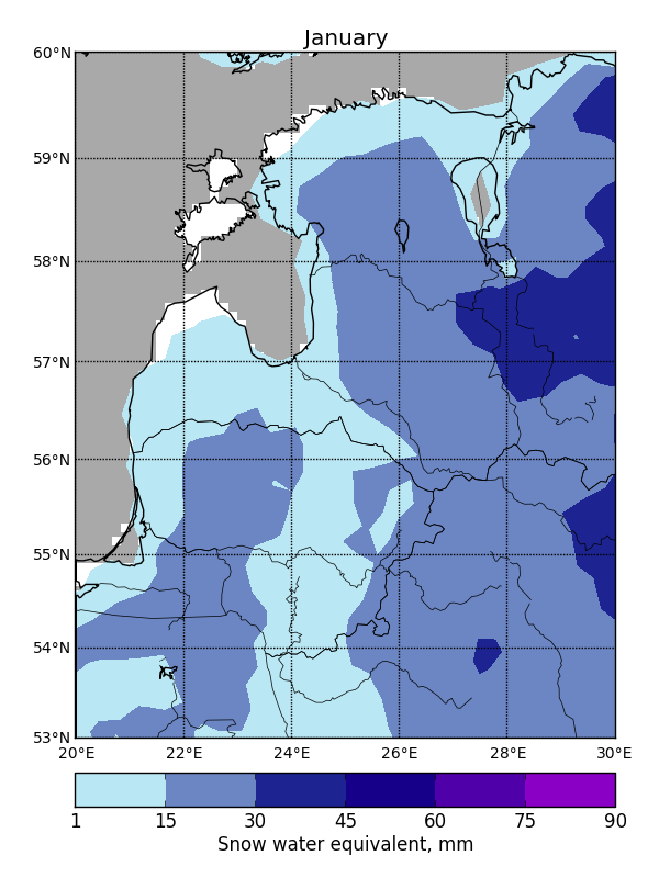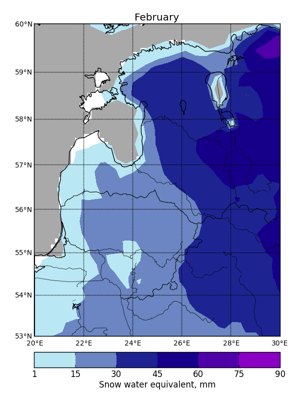 SWE can vary greatly between subsequent days due to temperature fluctuations or an influx of freshly fallen snow, so it is not possible to fill SWE data gaps using temporal filtering. Average maximum SWE in the Baltic States varies from 20 mm in the western coastal areas to 120 mm in the continental parts to the east (Fig. 1).