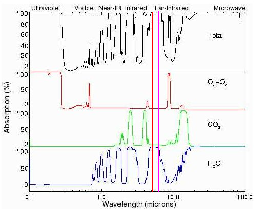 Figure 6: Absorption of radiation depending on its wavelength for selected atmospheric trace gases. The red line marks the 6.2 µm and the magenta line the 7.2 µm band.