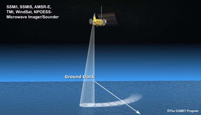 The SSMI/S instrument on DMSP satellites employs another scanning strategy. The so-called conical scanning produces narrower scan widths but maintains the resolution across the entire swath.