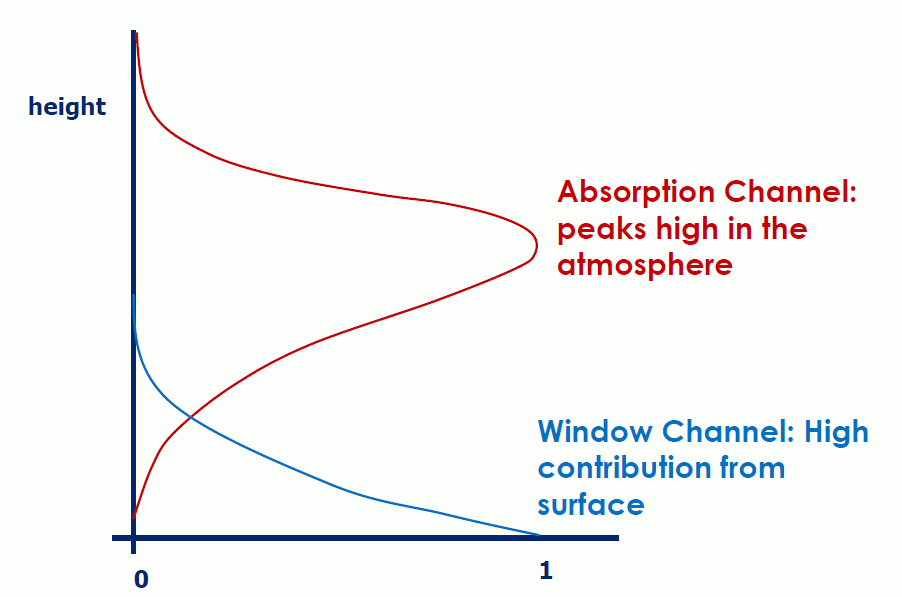 Now, as the extent of the absorption differs depending on the wavelength, the satellite "sees" different levels of the atmosphere. This effect is comparable to the visibility range in fog of varying density. The different atmospheric layers contributing with emitted radiation from VW molecules to the satellite measured total (or integral) radiation is represented in so called "contribution functions" (Figure 7).