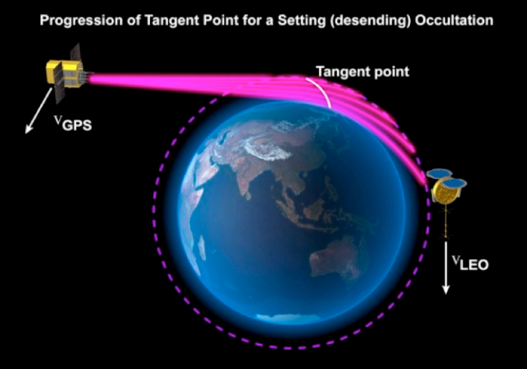 In contrast to the aforementioned microwave sounding instruments, the Radio Occultation (RO) method follows a horizontal (or, more precisely, tangential) sampling strategy. The basic principle of the RO method is that a receiver onboard a low-orbiting satellite tracks GPS (Global Positioning System) signals, as the transmitting satellite sets or rises behind the Earth (Figure 11). Due to refraction in the ionosphere and the neutral atmosphere the GPS signal is delayed and its path bent, enabling calculation of the index of refraction (or refractivity) and subsequently temperature and humidity as a function of height.