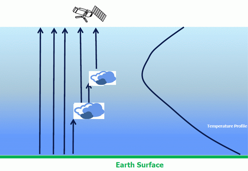 Figure 2: In atmospheric windows, radiation from the Earth's surface directly reaches the satellite instrument without interacting with the atmosphere. In case of clouds, radiation from higher atmospheric levels (cloud tops) reaches the satellite. Credits: Marianne König (EUMETSAT)