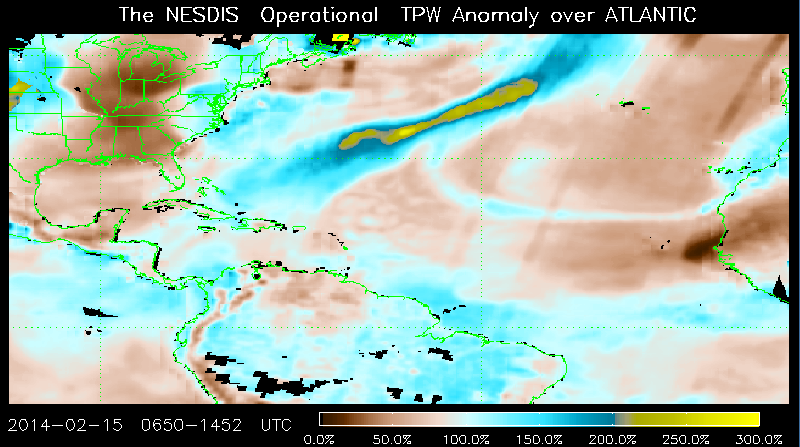 Figure 7: The NOAA NESDIS operational TPW Percent of Normal product over the Atlantic on 15 February 2014 at 15:00 UTC. Source NOAA.