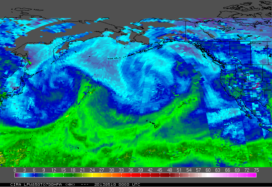 Modern TPW retrieval algorithms combine the data from many sounding instruments on various polar satellites into one unified global product image, so forecasters don't have to spend time looking at many different satellite images of TPW. This is beneficial to the forecaster in that their forecasts of hazardous weather can now be made more timely and accurate. Such products are called "blended" products. The Cooperative Institute for Research of the Atmosphere (CIRA) at Colorado State University has an experimental polar orbiting microwave layer precipitable water (LPW) product that is being used by forecasters in the United States and can be seen here. These four layers of precipitable water vapour (surface to 850 hPa; 850 to 700 hPa; 700 to 500 hPa; 500 to 300 hPa) are constructed using the combined microwave instruments onboard the NOAA, MetOp, DMSP and NASA Aqua satellites. MIRS (Microwave Integrated Retrieval System) retrieves many variables from these microwave sounding instruments, such as "Layer Precipitable Water" (LPW), "Layered Relative Humidity" (RH) and vertical RH profiles. The algorithm allows the retrieval of LPW over land and sea (Figure 4).