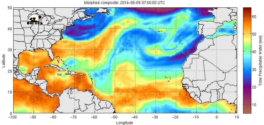 Figure 6: Morphed composite image loop of TPW (9 August 2014, 07 UTC to 12 August 2014, 06 UTC). Source CIMSS.