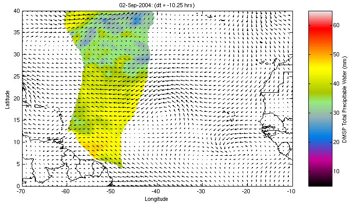 The procedure of morphing different satellite overpasses is generally employed to visualize TPW data on domains as static image or loop. In doing so, a swath scan is then advected backward and forward in time using the mean layer wind field in order to create synthetic hourly data (Figure 5). The final product is a composite of many "time-corrected" TPW swaths over a selected domain. As an example product which uses the morphing technique, see the MIMIC-TPW product at CIMSS.